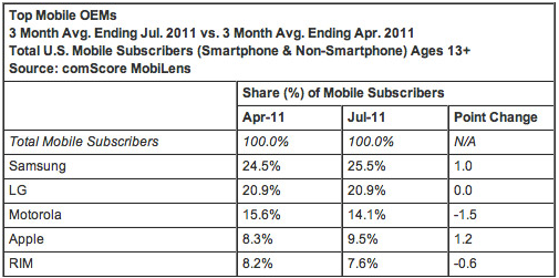 โดย comScore ผู้ทำการสำรวจตลาดโทรศัพท์มือถือสมาร์ทโฟน ในสหรัฐเอมริกา ว่ามีค่ายไหนมากสุดพบว่า แอนดรอยด์ นั้น มีส่วนแบ่งสูงเป็นประวัติการ ถึง 41.8% เพิ่มสูงขึ้น 5.4% ส่วนรองลงมาก็เป็นไครไปไม่ได้นอกจากค่ายผลไม้ Apple นั้นเอง มีส่วนแบ่งการตลาด 27.0% ตามด้วย RIM หรือ BB ,windows phone ,symbian ตามลำดับ